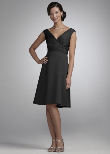 The Detailed Description of David's Bridal Short Satin Off-the-Shoulder A-Line with Ruching Style 83168, Black, 18