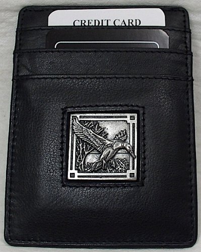 Our Executive Mallard Ducks Leather Money Clip/ Cardholder ~ High quality fine grain genuine Leather Magnet Money clip with 4 pockets to hold Credit Cards with the money clip on back. Finely sculpted pewter Mallard Ducks Emblem making for a very impressive looking Money Clip ~ New in Package ~ Best in leather craftsmanship ~ Would make someone a great gift