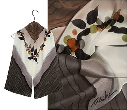 Spontaneously painting the dyes free-hand and skillfully manipulating their bleeds and edges as they merge with the silk, Ulrike achieves uniquely soft, multi-shaded images in which, unlike printed silk, colors are equally rich on both sides of the scarf.
