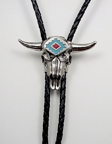 The Detailed Description of Turquoise/ Coral Inlay Polished Pewter Longhorn Skull Bolo TieFeatures