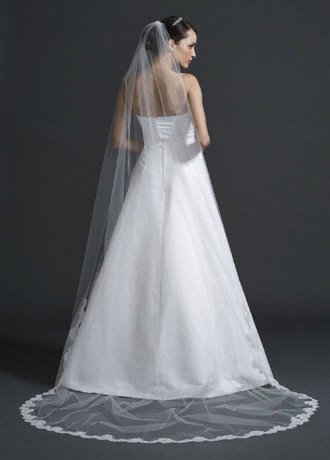 The Detailed Description of David's Bridal Bridal Veil with Pearls and Alencon Lace Edge Style VCRL538LONG, White