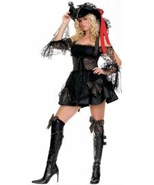 High seas luxury and lace set this Luxurious Pirate costume apart from the crowd. Includes a dress with decorative brocade faux corset front lace sleeves and stockings with matching brocade bow. Hat is not included.