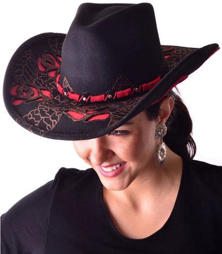 This black and red Western Women hat is full of detail with cutout in the shape of roses all around with a beautiful matching hatband in red and black. Roses decorate outside the brim adding to the beauty of this exquisite hat. A great hat for a Formal Western Wear. Wear this hat with one of our Western velvet vests, embroidered Jackets or our shawls in faux fur or embroidered western shawls. The Brim is 4". 100% Wool.
