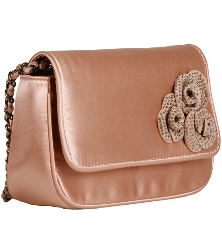 The lovely and versatile Anderson from Menbur, in soft, blushing, nude-tone satin, is perfect for a formal affair, but is also quite suitable for the occasion that is a bit more casual. The Anderson is carried with a shoulder strap of stylish gold-tone that is laced with nude-color fabric. The starring element, however, is the sweet trio of delightfully jeweled fabric rosettes, creating a look that is so very lovely and feminine.